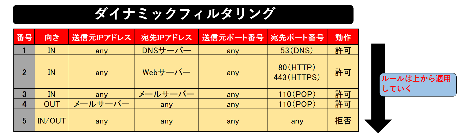 ダイナミック(動的)フィルタリングは、リクエスト等の行きのパケットのセッション情報(IPアドレス、ポート番号、TCPヘッダのフラグ等)を記録してその応答パケットだけを通過させる方式。ダイナミックフィルタリング方式によるフィルタリングルールの例を下図に示す。
