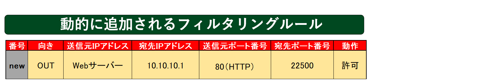 例えば、送信元の端末のIPアドレスが10.10.10.1、宛先ポート番号が22500のHTTP通信の場合、以下に示すルールが動的に追加される。