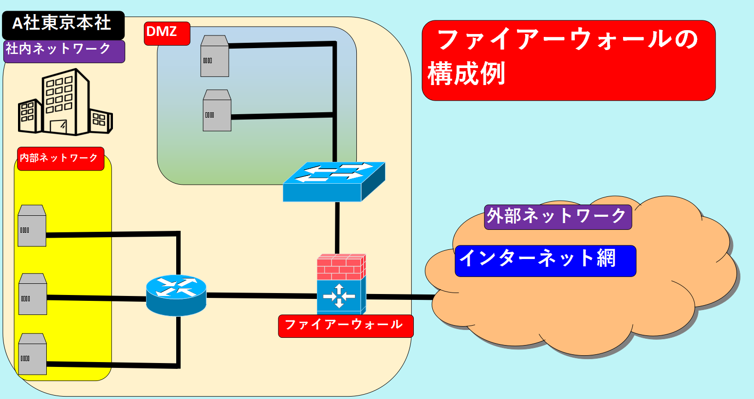 ファイアウォールによって、外部ネットワーク、DMZ、内部ネットワークに分けられる。外部ネットワークは、インターネットのような領域、内部ネットワークは社内ネットワーク。DMZは「非武装地帯」と訳し、内部ネットワークから隔離し、外部公開サーバーを置いておくファイアウォールで区分けされたネットワークを指す。