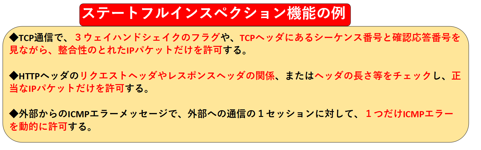 ここでは、@パケットフィルタリング機能とAステートフルインスペクション機能について見ていく。