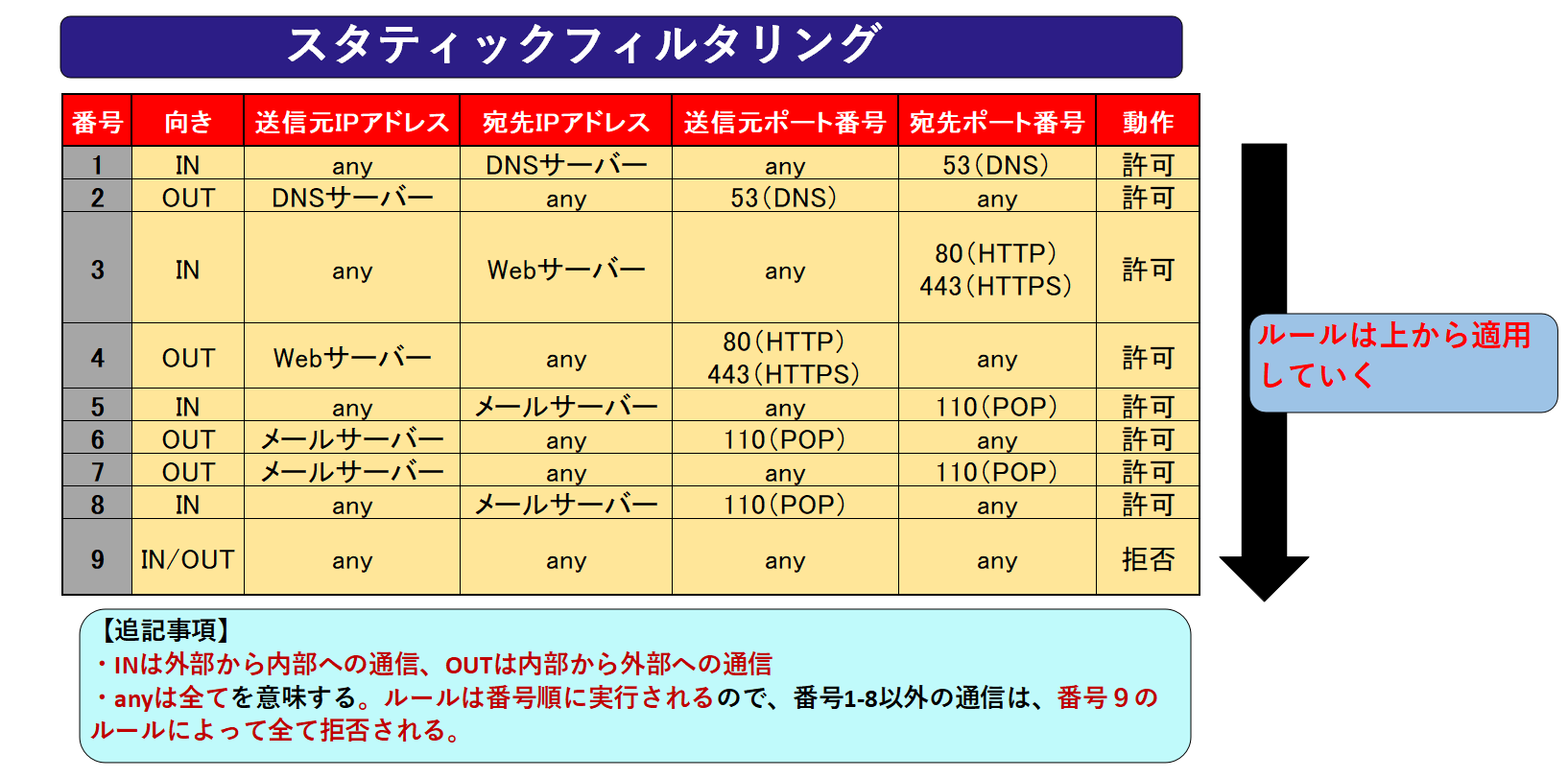 スタティック(静的)フィルタリングは、通信の制御ルールであるフィルタリングルールをあらかじめ固定的に設定する方式。スタティックフィルタリング方式によるフィルタリングルールの例を下記に示す。