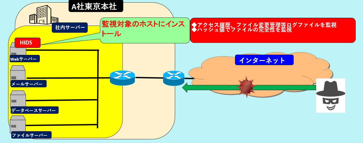 ホスト型IDS/IPS(HIDS/HIPS)は下図の様に、監視対象のホストにインストールして、ホストが出力するログインログや、リソースへのアクセスログ、サーバーソフトウェアの動作ログなどを監視して異常な動作を検出する。