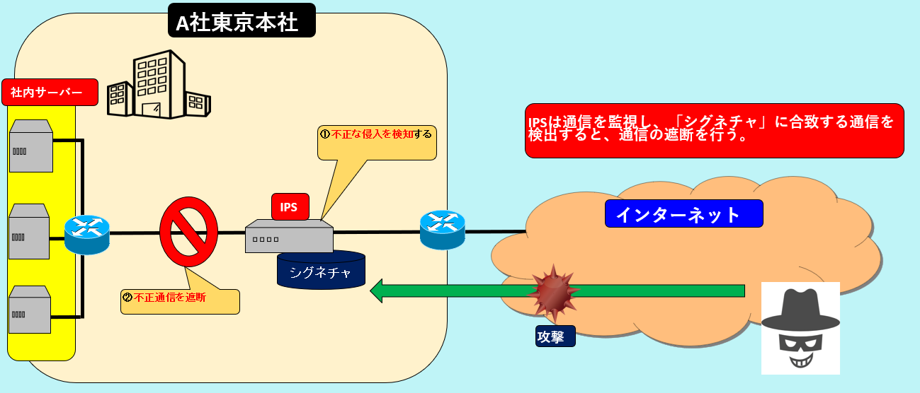 IPS(侵入防止システム)とは、IDS侵入検知機能に加え、検知した攻撃の破棄や、検知以降の通信を遮断して、侵入を防止する機能を提供するシステム。