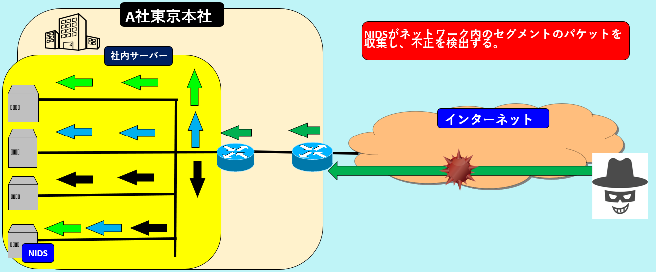 ネットワーク型IDS/IPS(NIDS/NIPS)は、ネットワークセグメント内のパケットを収集して不正を検知するIDS/IPS。