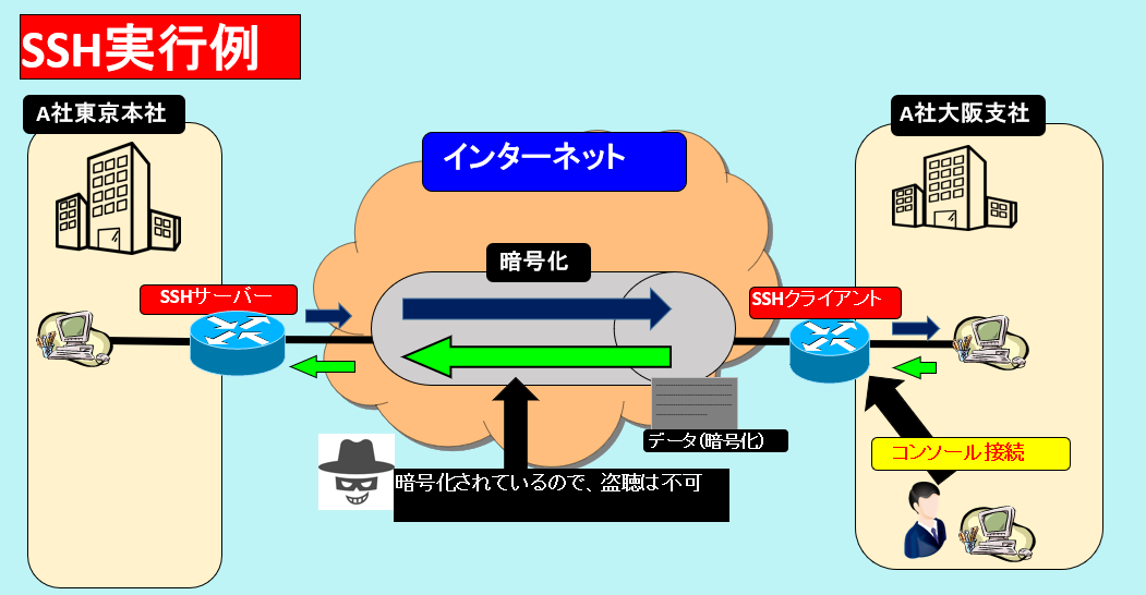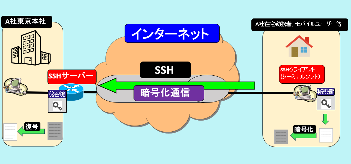SSHは、強力な暗号化と認証機能によって、ログイン後にやり取りするデータが全て暗号化されるので、管理者は安全にリモートログインを利用することが出来る。