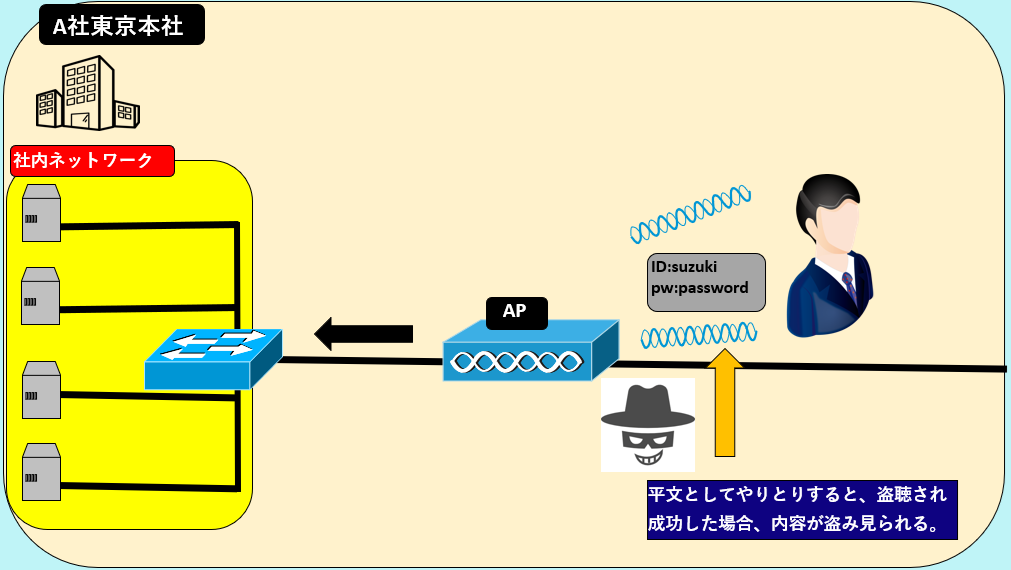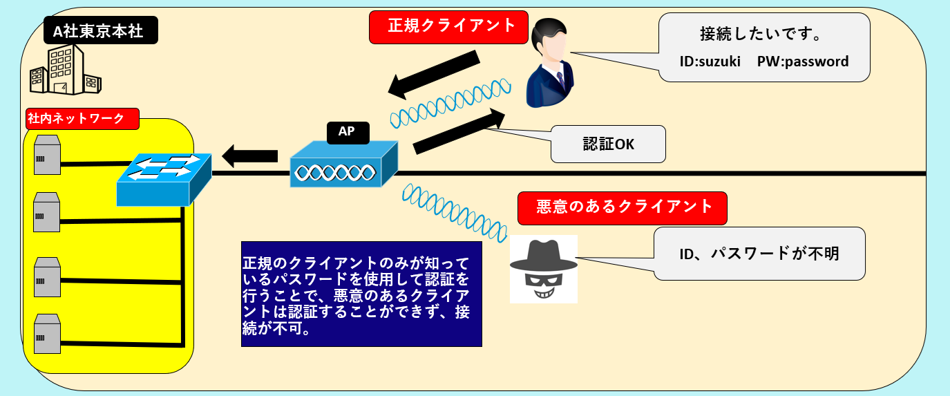 そして無線LANは、関係が無いユーザーにも使用されやすい。無線LANは、ユーザーを限定する機能が弱いので、第三者が社内ネットワークにアクセスするのを許可してしまったりする。
